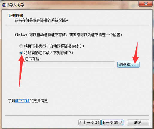 8.选择“受信任的根证书颁发机构”,继续“下一步”,如下图所示: